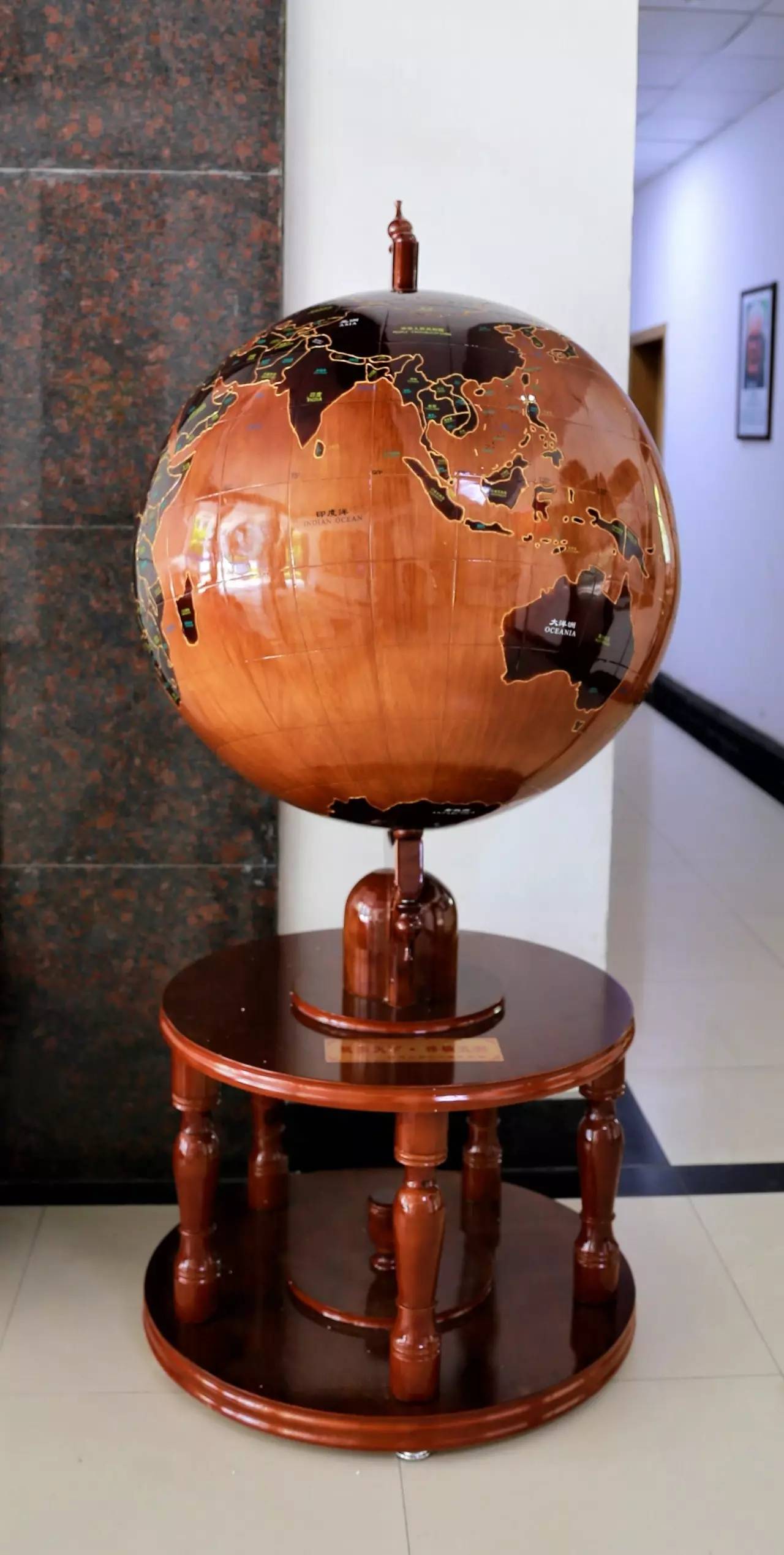 97届系友准备的礼物也早早放置在了系楼——正是近几天吸引了无数师生驻足观赏的地球仪。地球仪约一人高,球体部分至少需要两人才能合抱,通体棕褐色,各国各洲清晰可见,寓意“桃李满天下,梓楠遍五洲”。