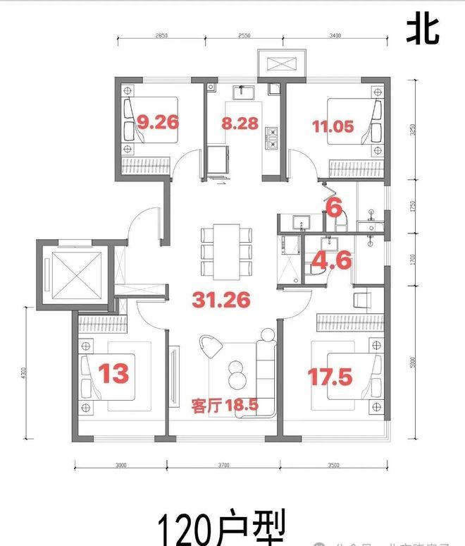 ,四叶草格局,三代人共居也能互不打扰。入户设置了独立玄关,中央餐客厨一体化。主卧套间继续升级,配有独立卫浴+衣帽区+270°转角飘窗。双次卧+厨房朝北,次卫三分离设计。